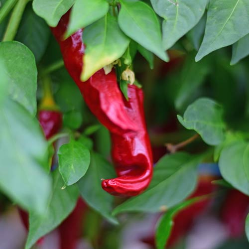 Info: The Piment dEspelette Chili is a traditional and extremely flavourful variety from the French Basque Country. If they are grown in the area around Espelette, the AOC (Appellation d`Origine Contrôlée; Controlled Indication of Origin) quality label can be used. The bushy plants are very high yielding, and the thick-walled, juicy chillies ripen to a beautiful shiny red with a mild spiciness. Professional and hobby chefs as well as gourmet lovers around the world prize the typical flavour of the Piment dEspelette, which, in its region of cultivation is usually dried and made into the famous flavourful powder. They are also suitable for fresh consumption, for stuffing, cooking, grilling and filling. In France, pastes (coulis, compote), jams and mustards are often made from them.