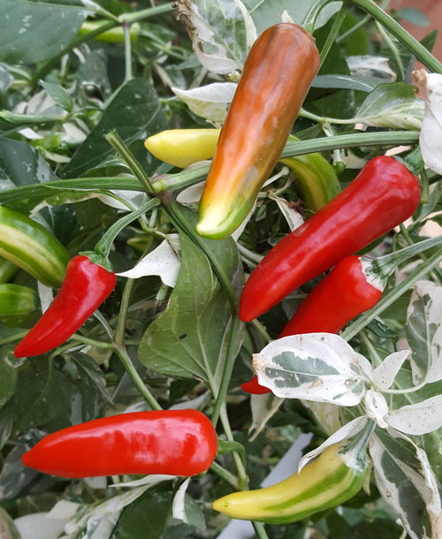 Info: The Fish Pepper Chili from Africa - as its name would imply - is used for refining fish dishes and supports the fine flavours of fish and seafood. This chili is particularly decorative due to its white variegated leaves, and the chillies are initially green-white striped and then ripen with orange coloured stripes to red. When the chilies are completely red, the ripening process is completed. They have an intense pepper flavour, a medium spiciness and are suitable not only for fish, but also for cooking, seasoning, pickling and for fresh consumption.